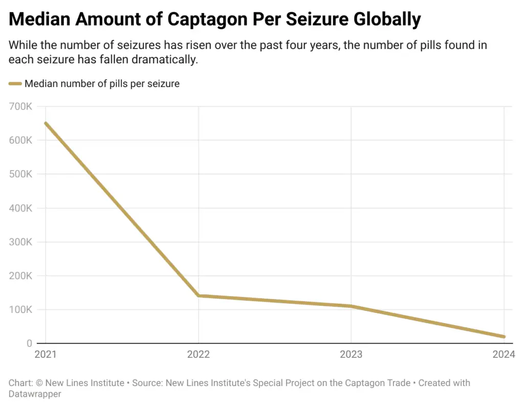 This suggests a shift toward smaller-scale production operations. The Assad regime provided state sponsorship, security coverage, and access to raw materials that facilitated industrial production, the true scale of which was revealed following its downfall. In the first four months of 2025, the new caretaker government in Syria seized over 200 million pills from production facilities and warehouses, including military installations, which is 20 times the amount Assad’s forces seized in all of 2024.