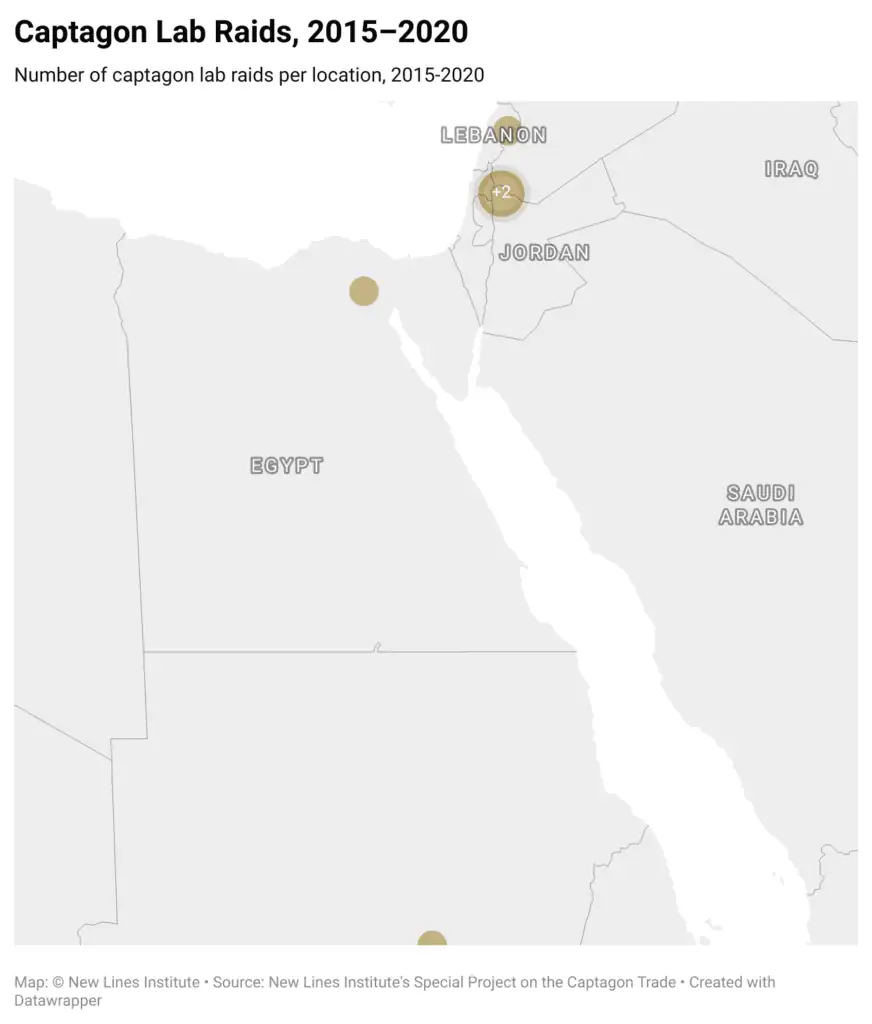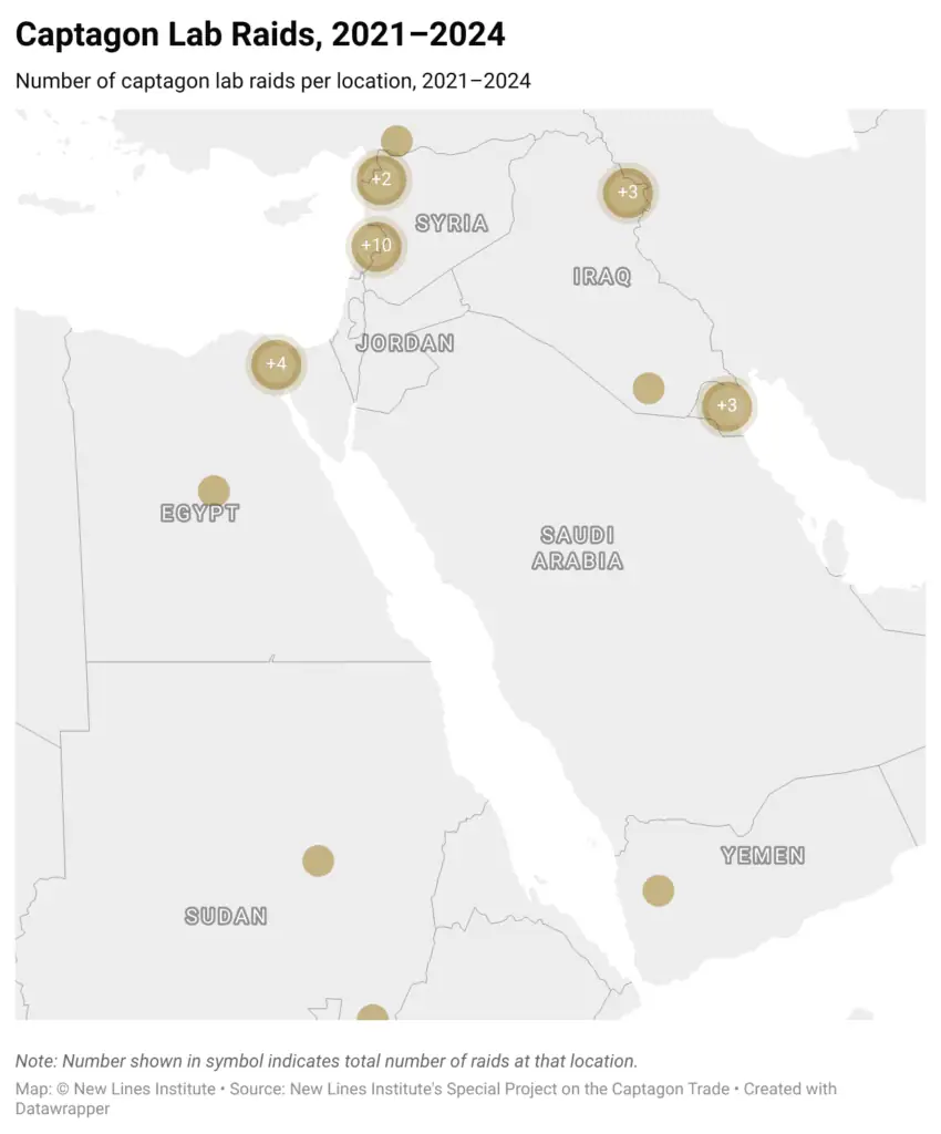 Comparison of Captagon Laboratory Raids: 2015–2020 (image on the right) vs. 2021–2024 (image on the left) — Data from the